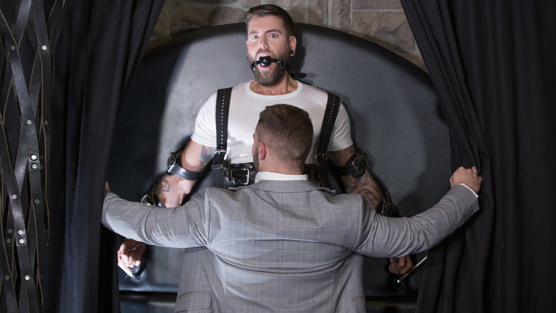 Drew Dixon is just looking for a little refreshment when he enters Diego Reyes's bar, but he finds a lot more than that when he glimpses the owner domming a tied-up and gagged sub in his private sex dungeon. Drew sneakily peeps at the erotic sight, then hides when the sub taps out as he can't take the heat. Diego catches Drew watching him jack his big dick, and the horny bottom begs to be punished, promising he can take whatever Diego dishes out! Diego collars Drew and makes him suck his cock, then treats Drew's ass to tantalizing licks and stinging slaps before fucking that tight hole. Once the master cums from pounding Drew in missionary, he allows his obedient sub to jack off till he cums.