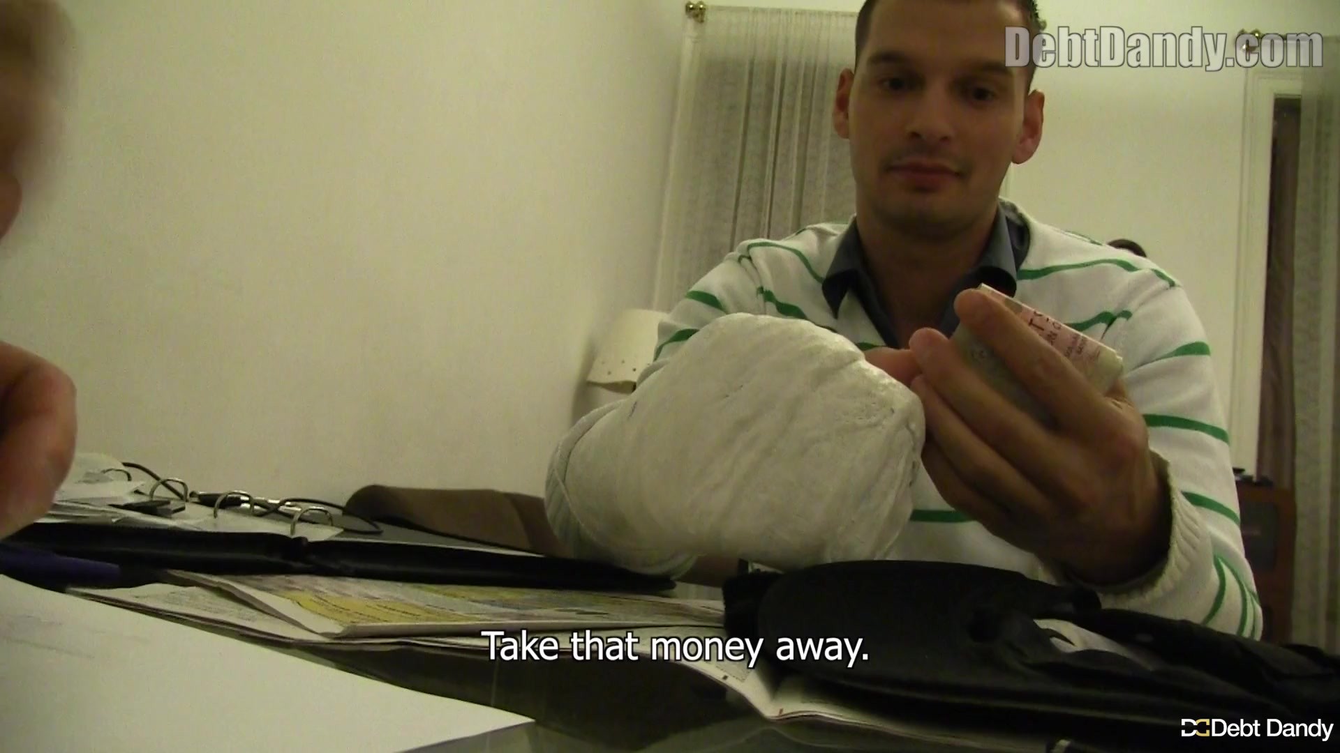 Every week I meet new young men. They all have something in common: their debts. I always listen to their stories. How it happened and why. But every now and then I meet some special guys who have a special story to tell. This time I got a call from a young man who lost his job and who has problems paying his rent. So far nothing new. But when I visited him I noticed that he was not that typical type of client. He simply broke his arm and as he worked at a construction site he will be unemployed for several months now. And as he didn´t have an insurance he was eager to meet me. He thought that I might offer him the loan which his bank refused to give. But would he accept my special conditions, too?