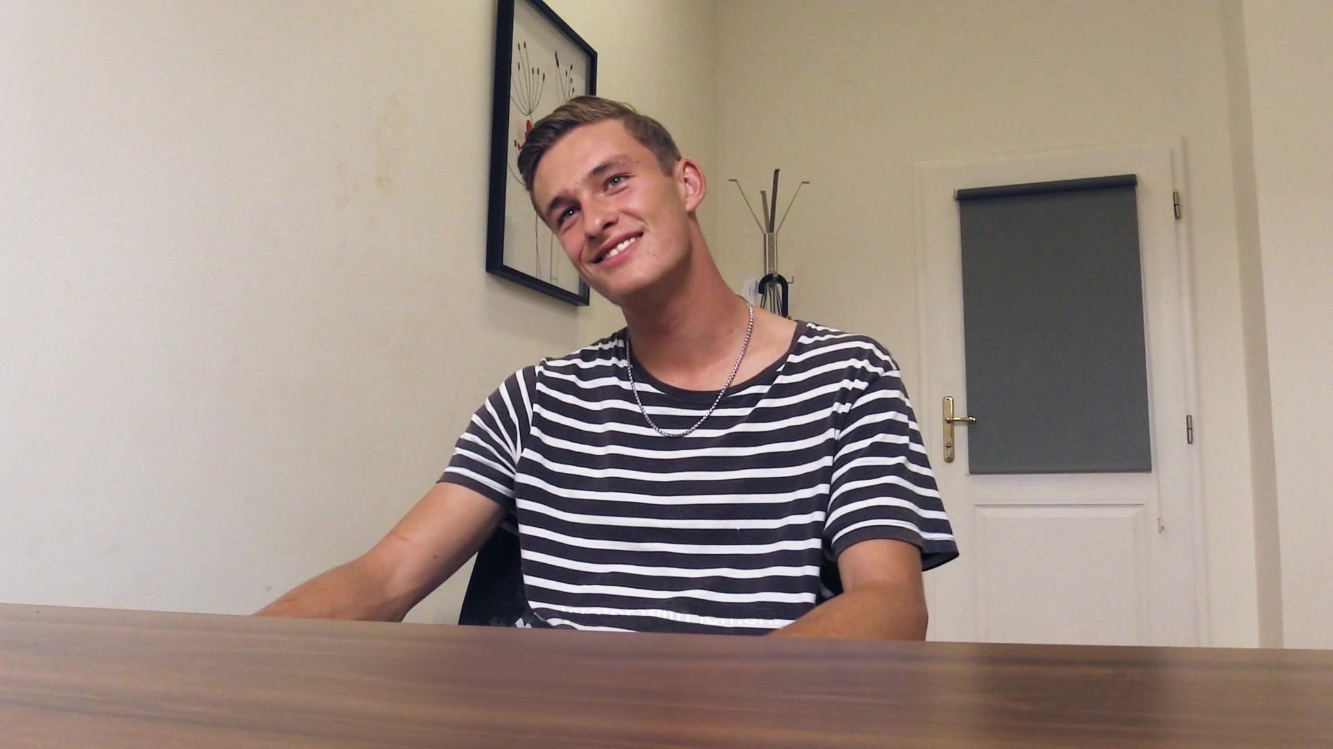 In a different life this guy could have been a great athlete or footballer. He loved all kinds of sports and he had a great look. A perfect combination for a successful life. Unfortunately, he got seriously injured when he was 14 years old. With all his dreams crushed into dust the guy studied engineering and then worked at a factory. He made nice money but the job was exhausting. He decided to move to Prague and find something less stressful. I had a job like that open but I wasn't going to hire him easily. This cutie had to work for it hard. Maybe too hard because he wasn't too excited by the whole experience. Once I was done with him, he had trouble sitting... Even though I tried to be gentle the whole time. And I am rarely this considerate and careful while fucking my virgin applicants.