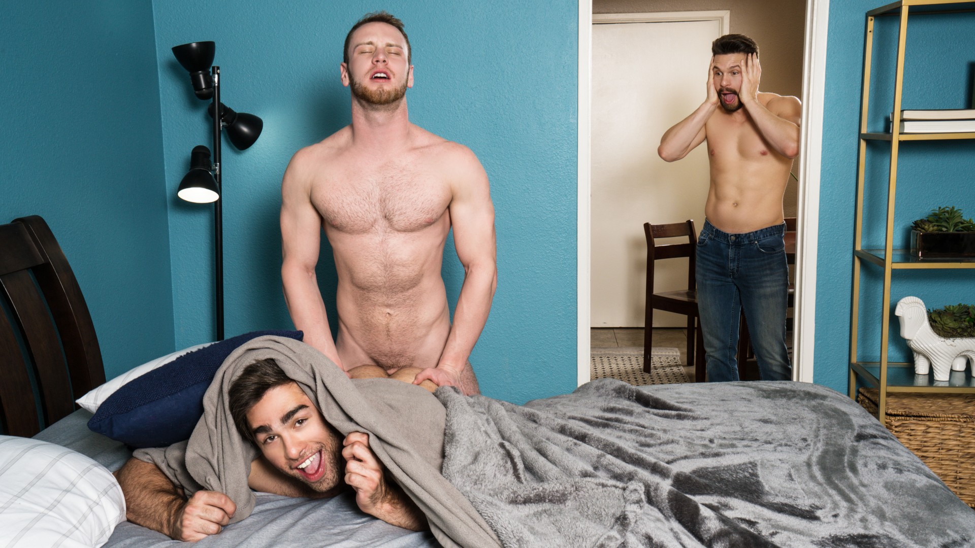 The boys are sitting around comparing sex toys, and love what they have so far. Athletic Casey Jacks and fit Lucas Leon both have dildos while chiseled Brandon Evans lucked out with a realistic ass. Good-looking Brandon excuses himself, and heads off into the bedroom to test out his new toy. Curious Lucas sneaks over, and watches it all go down until he gets the chance to go in and swap places with the toy. Brown-haired Casey had the same plan in mind and switches places with Lucas after his round of ass pumping. Blue-eyed Brandon finally realizes what’s going, and gives them both an ass full more of his big cock.