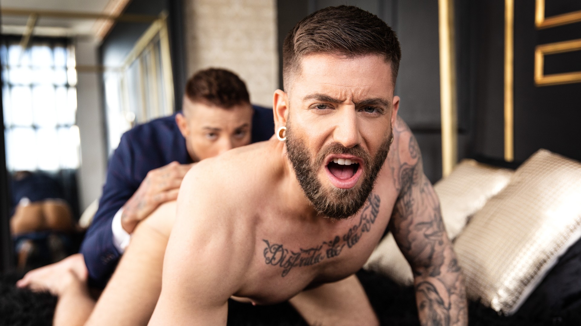 There's nothing hotter than a sharp-dressed man, as Rico Vega realizes while watching his boyfriend Klein Kerr don a crisp white shirt and sharp tailored blazer. Rico rubs his cock, then lets his robe slip off and grinds his ass against Klein's bulge. The top realizes he doesn't have to go out just yet and runs his hands all over his tattooed boyfriend's body, kissing him passionately. Rico unfastens Klein's belt and drops to his knees to suck his cock, then gets on the bed on all fours as Klein rims him. The top lets his shirt fall open as he fucks Rico doggystyle, then sucks the bottom's hard dick. Rico rides Klein reverse, and this passionate couple gaze at each other as Klein fucks his man missionary till Rico orgasms, then pulls out to shoot his hot load on the bottom's abs.