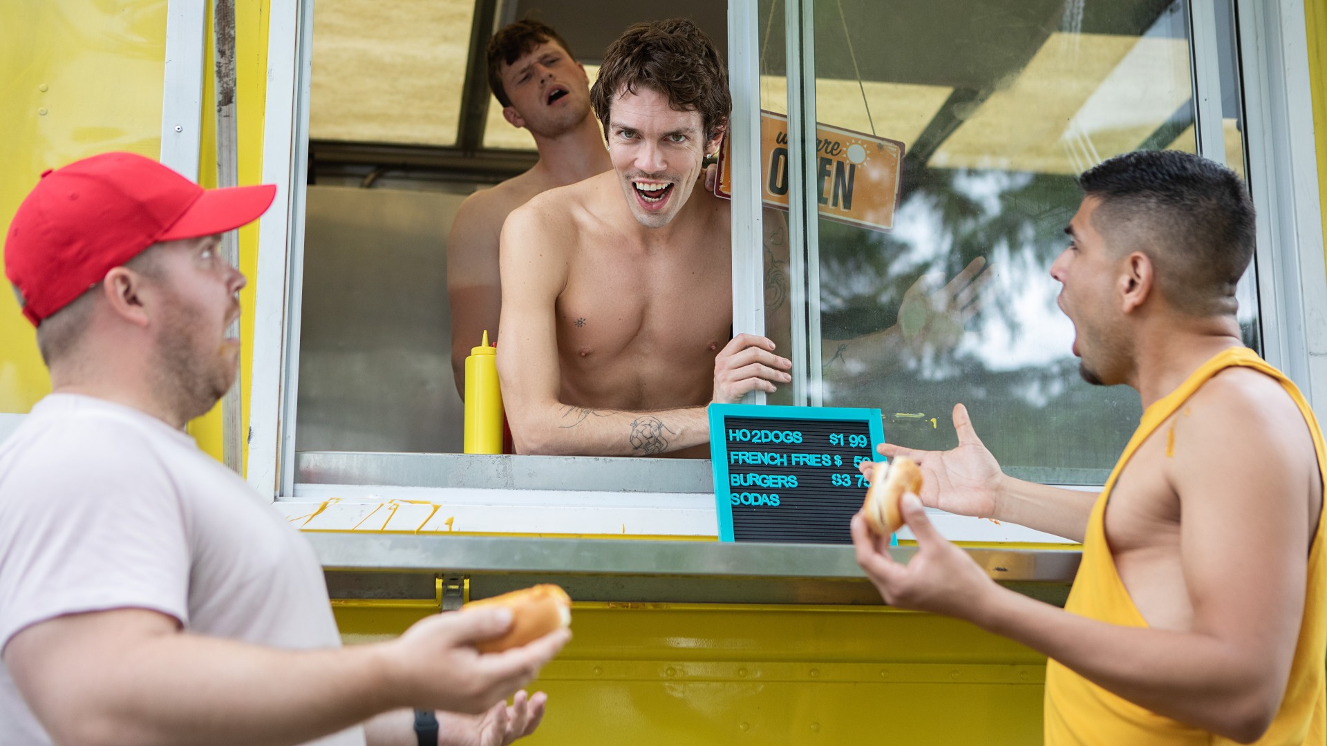 Chris Cool is a regular at Finn Harding's food truck, and not for the hot dogs. As Chris's flirting starts interfering with business, Finn invites him inside so they can work and play at the same time. Chris tries to take orders as Finn rims him, but he's not a people person... he's a cocky person, so he sucks Finn as the top works. Finn bends Chris over to fuck him doggystyle as Chris mans the window, then pounds the bottom on the counter. Chris takes Finn's big sausage in his buns till he cums, then puts the top's dick in a bun and takes some special sauce on his face.