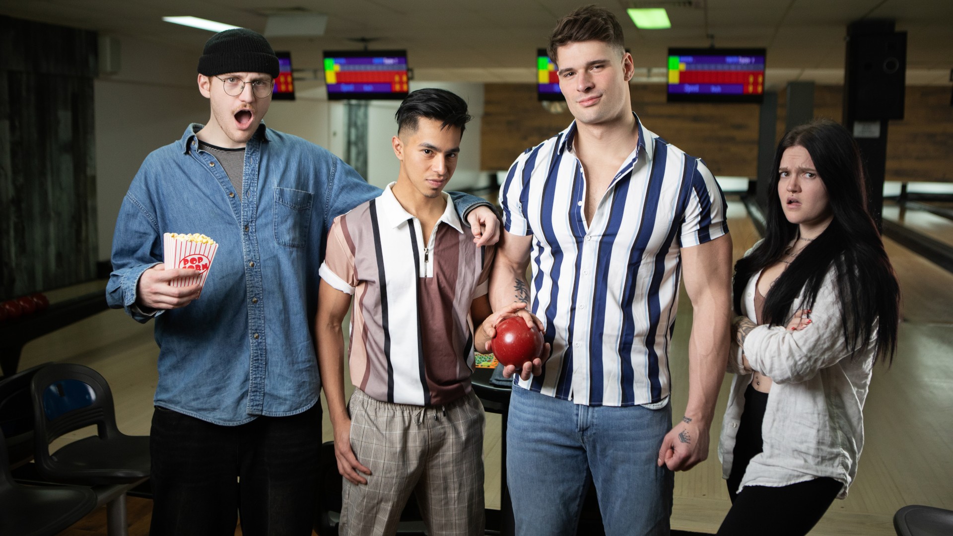 Angel Santana asks his pal's hot BF Malik Delgaty for some pointers on his bowling form, and gets turned on when the hunk's junk grinds against his booty as Malik comes behind to show him how it's done. But Angel gets the wrong kind of split when he bends over and rips his pants! Malik notices the easy-access hole and sneakily fucks Angel, then the bottom sucks him. Malik bends Angel over before the dark-haired twink rides that big cock. Malik drills the bottom at the scoring table till Angel orgasms, then pulls out and shoots cum to spare.