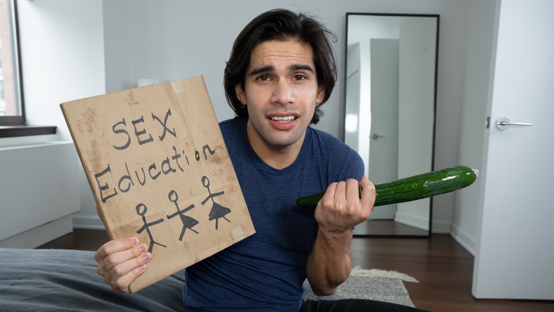Your new stepson, Ty Mitchell, has some questions about his sex ed lesson, and he's come to you for help. You teach Ty how to put a condom on a cucumber... but a few minutes later you catch him in the bathroom, fucking his ass with it! Ty asks for more instruction, starting with how to suck your cock, and then you finger his hole. You teach Ty to put a condom on your dick with his mouth and fuck him doggystyle, but he wants to feel what it's like to get fucked bareback and takes it off! Ty tries out riding you, then cums as you pound him on the bathroom floor, and you finish up by teaching him to take a facial.