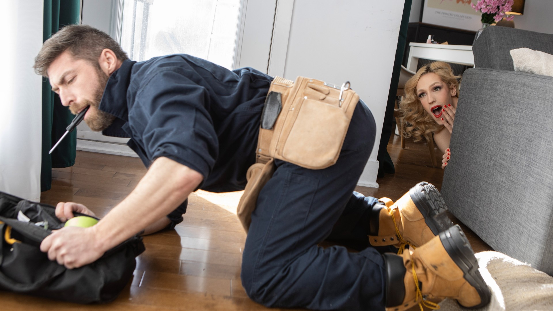 Femboy Troy River is all dolled up when bearded hunk OnlyMatt arrives to install the internet. Troy directs Matt where to jack in, and watches his ass as he bends over. Once the install is done, Troy offers Matt some refreshment, and as Matt's bent over the fridge, he rips open his coveralls and fucks his hole! Matt's excited to suck the femboy and then ride him on the couch while Troy jacks his cock till he cums, then he licks the femboy's balls till Troy shoots his load.