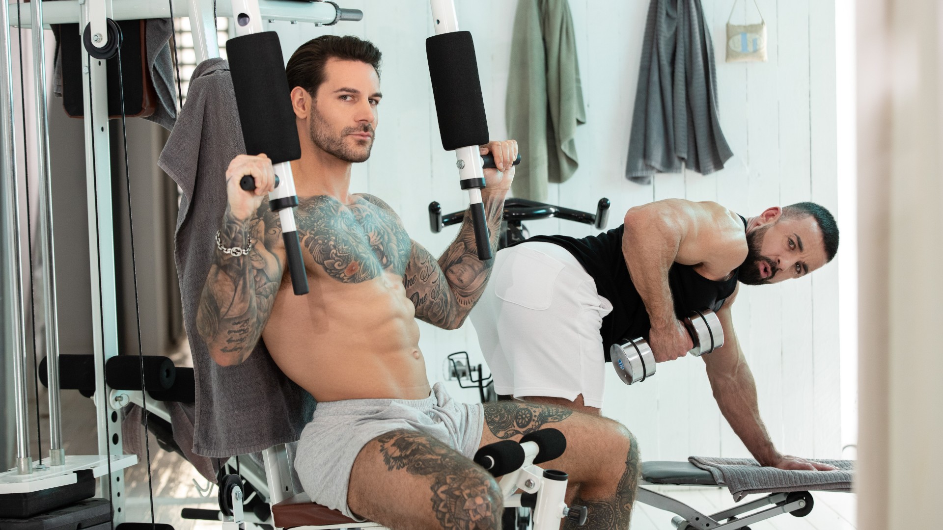 Papi Kocic and Giuspel are pumping iron in the gym, and as the guys eye-fuck each other, their muscles aren't the only thing getting hard. Horny top Papi finally can't take it anymore and kisses Giuspel, pushing his head down to lick his nipples and armpits. The bottom gets on his knees to suck Papi's balls and give the top an enthusiastic blowjob, then Papi teases Giuspel's hole and gets it good and wet before fucking him doggystyle. The top takes the opportunity as Giuspel sucks him to get in a few bicep curls, then fucks him on the bench. Giuspel rides that big dick till Papi cums on his face, and jacks himself off as he sucks out every last drop.
