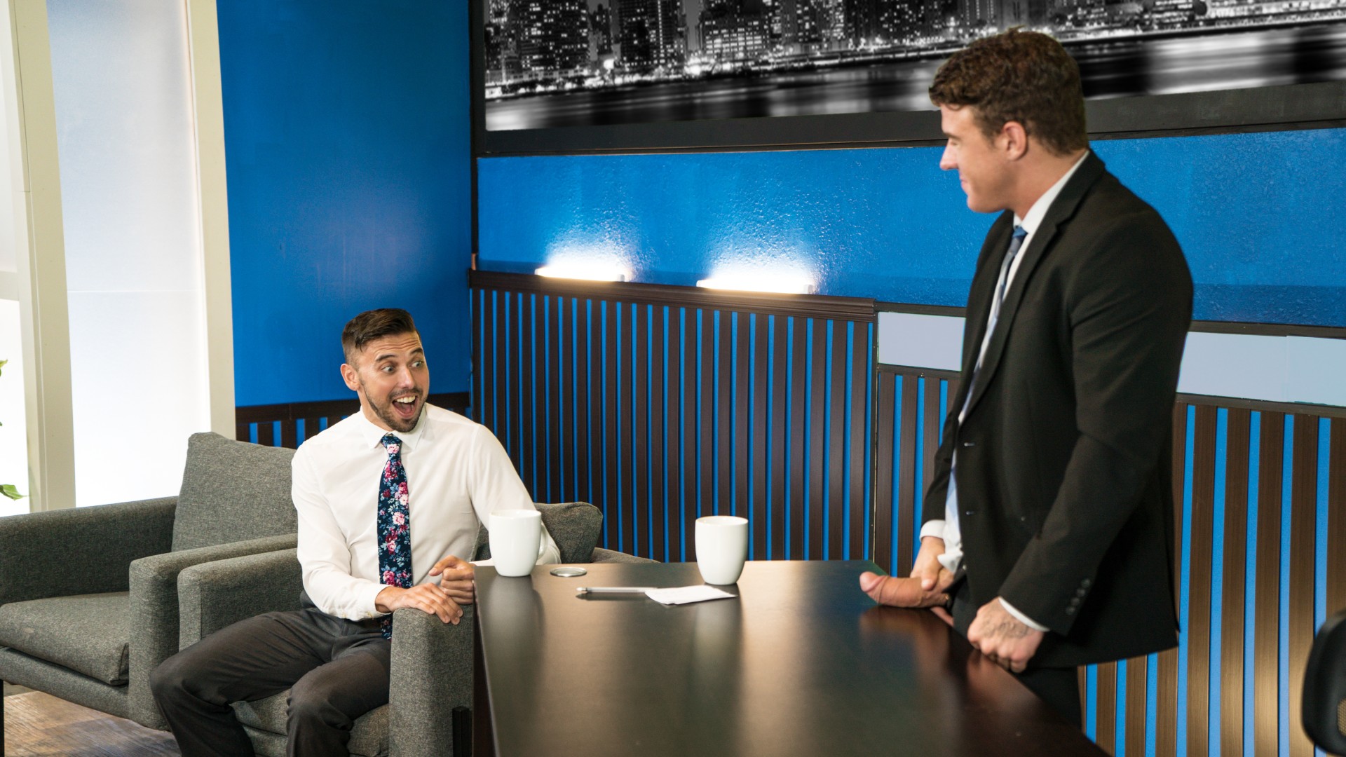 Tall hunk JJ Knight is the host of Primetime, and his ratings have been dropping. He isn’t happy that they moved his show to a later time slot, but he is determined to climb the charts again! His first guest of the night is athletic, cute Shane Jackson, and the only question he wants answered is about the size of the biggest dick he’s ever taken. Brown-haired Shane is a little shy to answer, but horny JJ whips out his massive cock so he can compare, and soon the two are fucking on live T.V! Will the ratings rise as quickly as their hung dicks?