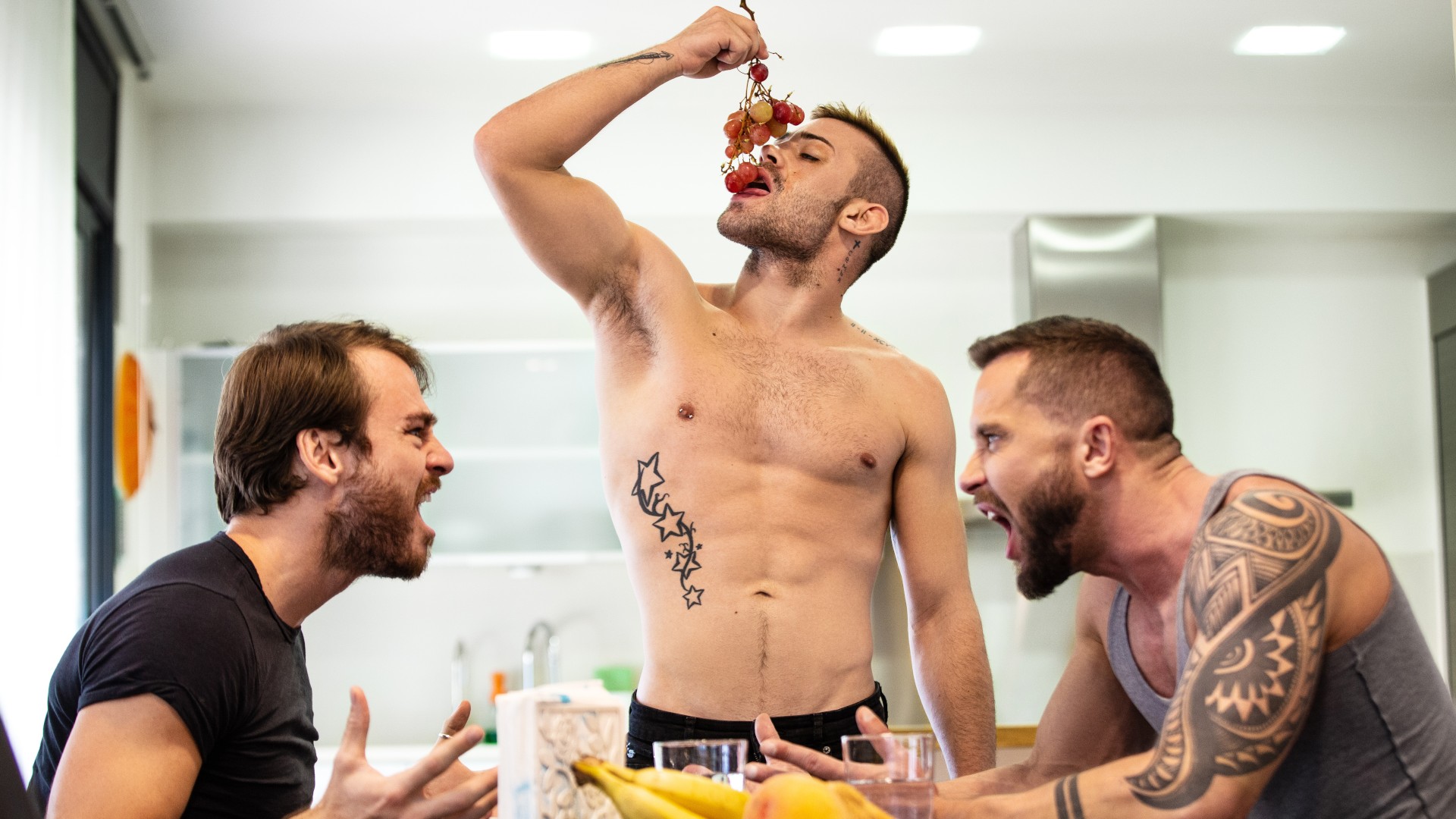 Max Adonis and his hubby are getting romantic when Max hears a noise and insists on investigating. They find Ricky Blue dripping wet. The next day, their mysterious houseguest overhears Max on the phone telling someone he'd like to take Ricky's cock, and Ricky uses his muscular body to distract Max from his work and keep him away from his phone... so he can't hear about the escaped madman on the loose. Ricky definitely goes wild as he fucks Max's mouth and eats his ass, then bends the bottom over the kitchen island to breed his hole. Can anyone who makes Max cum this hard really be bad?
