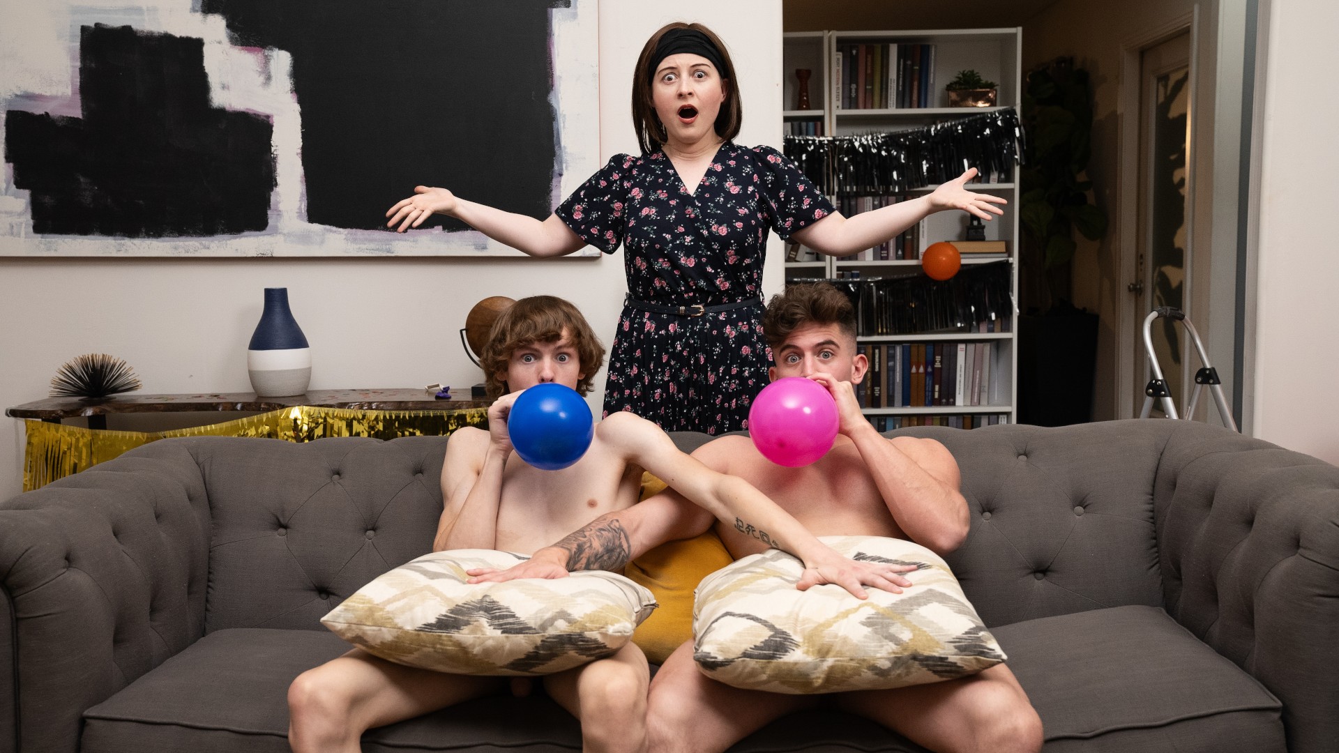 Spikey Dee's girlfriend is throwing yet another party, and as per usual she's stressed and he's been roped into decorating. At least until her gay friend Trevor Brooks shows up to help blow up balloons... and Trevor assures Spikey he blows like a pro, then notices the supposedly straight guy's hard dick poking out the leg of his shorts! As the guys try to hang up a banner, Spikey nearly falls off the ladder, and Trevor catches him by his big cock, then sucks it. Spikey fucks the bottom's mouth, then his hole, and Trevor rides him on the couch. The top fucks the handsome hunk in missionary till he orgasms, then tells Trevor to get on his knees for a facial!