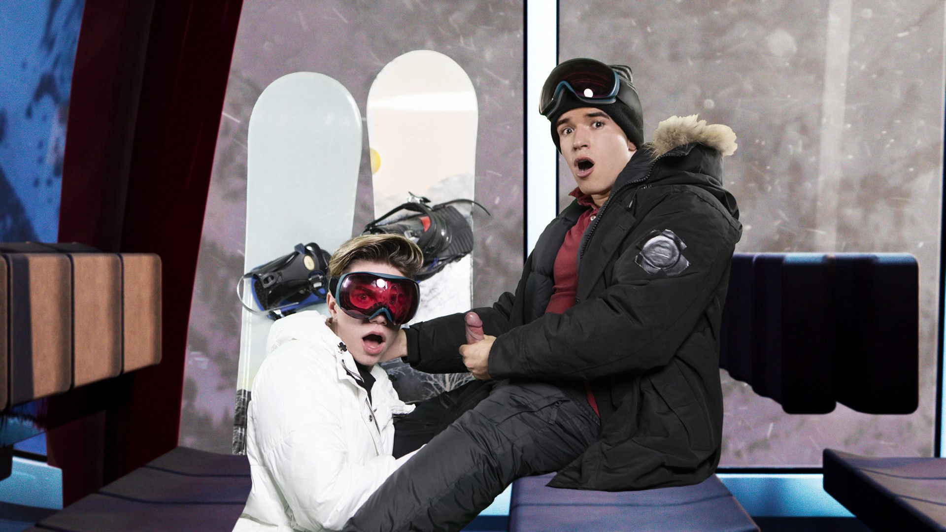 The great outdoors makes Maverick Sun horny, so he asks his boyfriend, Jordan Lake, for a sneaky chairlift BJ... but not sneaky enough, as they get caught by resort security just as Maverick cums on Jordan's goggles. That night in the chalet, they decide to pick up where they left off, but Maverick doesn't want to wait and rips open Jordan's long johns to fuck him in spoon position while his parents have their backs turned building the fire. After Jordan sucks Maverick under the blanket, finally the coast is clear for these twinks to fuck doggystyle. Jordan rides Maverick, then cums as the top bangs him missionary, and Maverick buries his cock deep in Jordan's hole to give him a creampie!