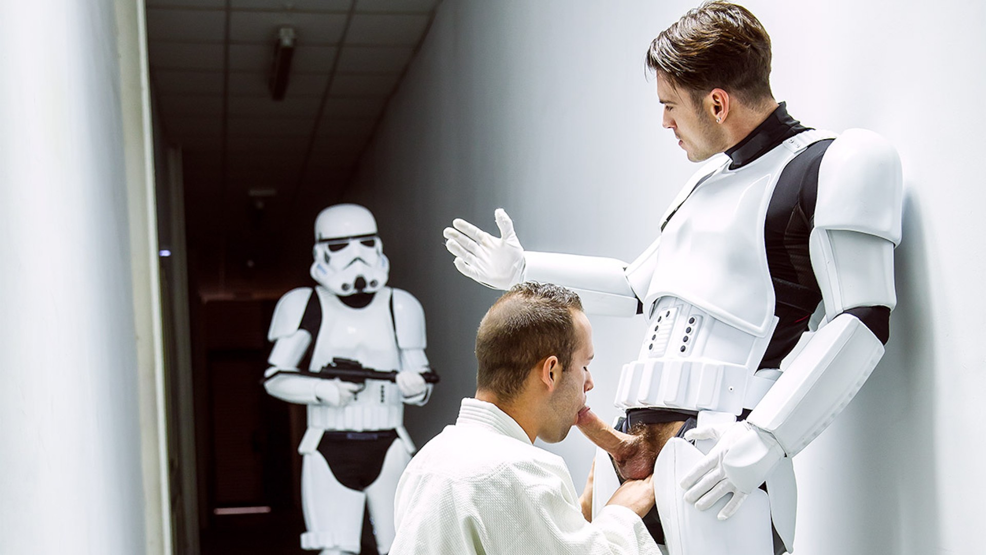 Paddy O'Brian is back for an intergalactic fuckfest in the finale of this epic Star Wars parody. Just when you thought he was lost in deep space, Paddy arrives with his fat cock in hand to drill Luke's bubble butt. Of course, we can't disappoint Hector De Silva and the other troopers, who have been searching far and wide for the perfect ass to plow. Luke is gangbanged and bathed in hot trooper cum in this truly monumental Star Wars parody.
