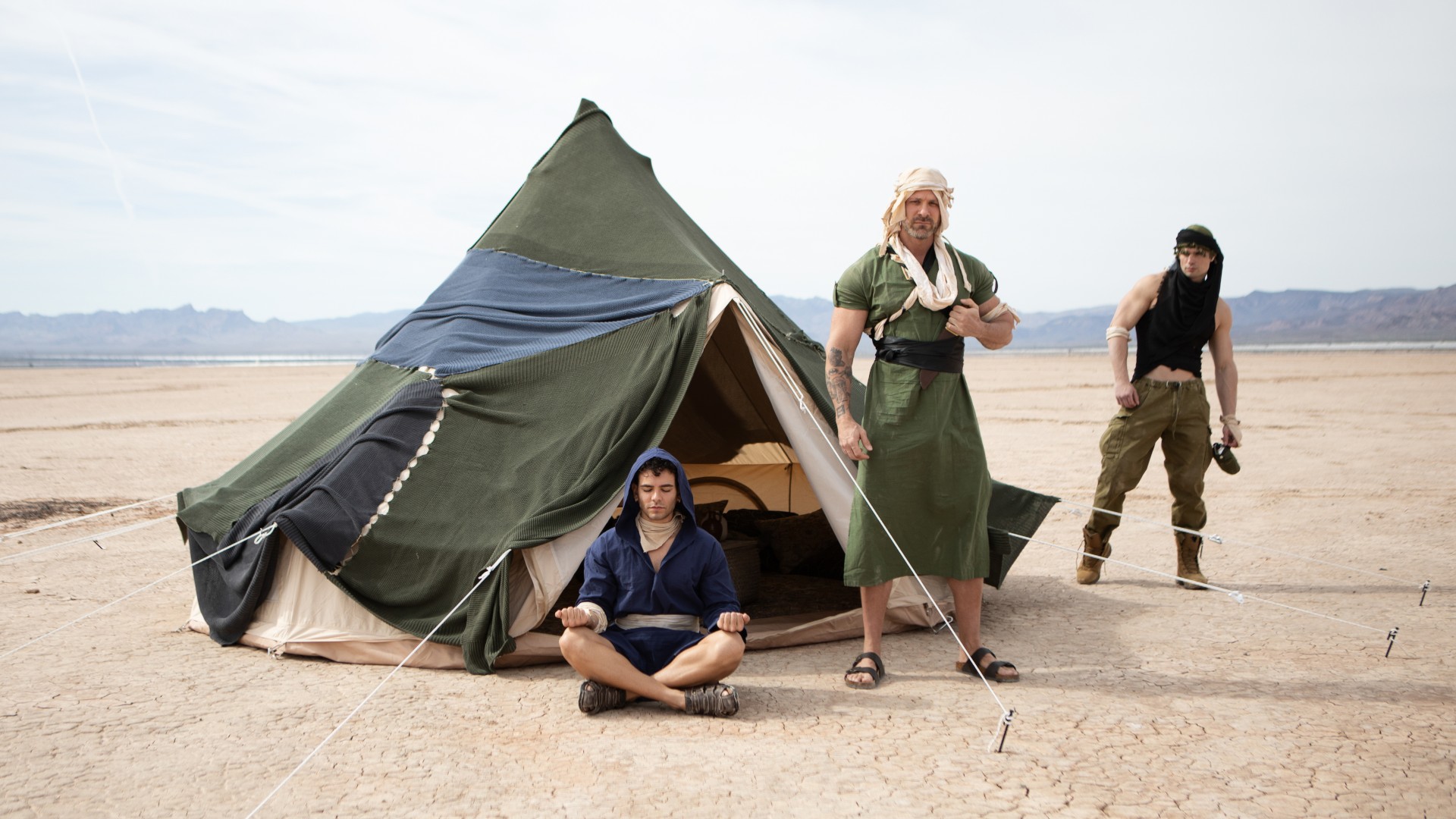 In a post-apocalyptic wasteland, Malik Delgaty wanders the once-verdant desert searching for something more precious than gold: water. After drinking the last dregs from his canteen, he sees a tent and drags himself closer. Inside, Austin Wolf and Damian Night have water, but no food, but Damian wants the precious source of calories in Austin's balls! Malik watches, touching himself, as Damian sucks the top's cock. Austin rims him, then fucks the bottom doggystyle. The secret watcher jacks his dick as he watches the submissive bottom ride the top and get fucked till both orgasm, but as Malik is plotting how he can get his hands on some of their water, he gets a surprise...