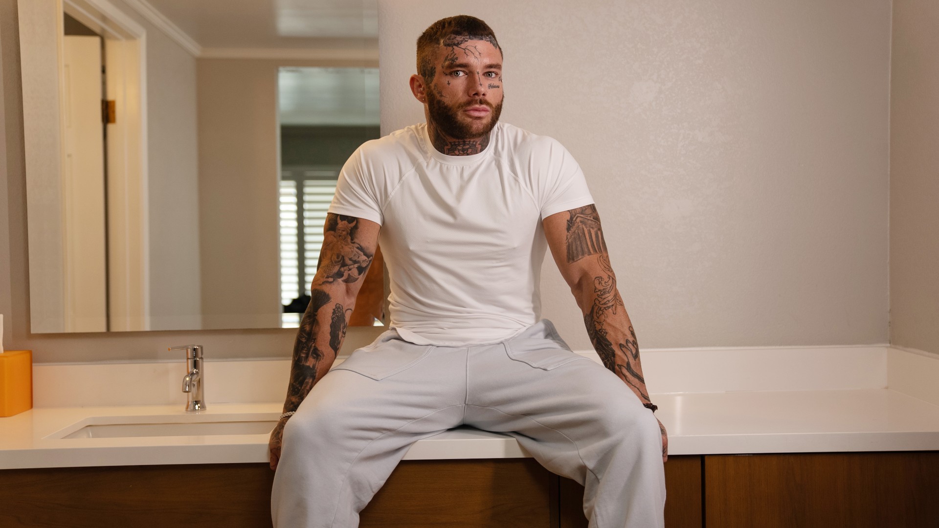 Joey Mills sharing their hotel room doesn't stop Joel Hart when he wakes up horny in the middle of the night and wants to fuck, but it does stop his GF. Joel's wanking wakes up Joey, who's happy to offer a hole for the tattooed top! He sneaks over to suck Joel, who even lifts him up for an upside-down blowjob while his girlfriend gets some shuteye! The guys head to the bathroom, where Joel tongues Joey's hole, then drills him on the counter. The bottom cums as he rides Joel on the floor, then the tattooed top pounds him against the wall and shoots on his face.