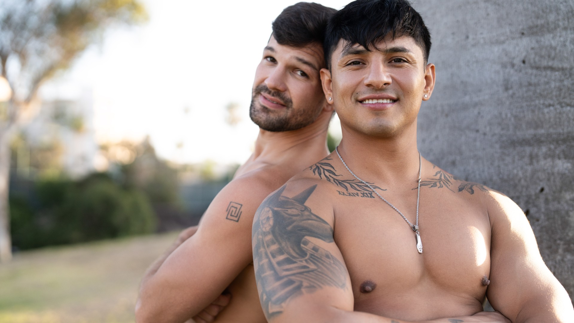 Ian and Brysen toss a football around in the park, stripping off their shirts at golden hour to show off their chests kissed by the sun. The handsome, tattooed hunks admire each other as they flex and pose, and by the time they get back to the bedroom they're raring to go. Brysen is the first to take off Ian's shirt and kiss down his chest, and Ian eagerly returns the favor. "So big..." Brysen says, nuzzling his face against the top's bulge before tugging down Ian's shorts to suck that dick. Ian rims Brysen's hole, then fucks him doggystyle and missionary till the bottom cums. "Keep using me," Brysen moans! He rides the top, then takes that big dick in doggystyle till Ian paints his back. Brysen cums again as Ian fingers his hole. "That was hot," the top chuckles.